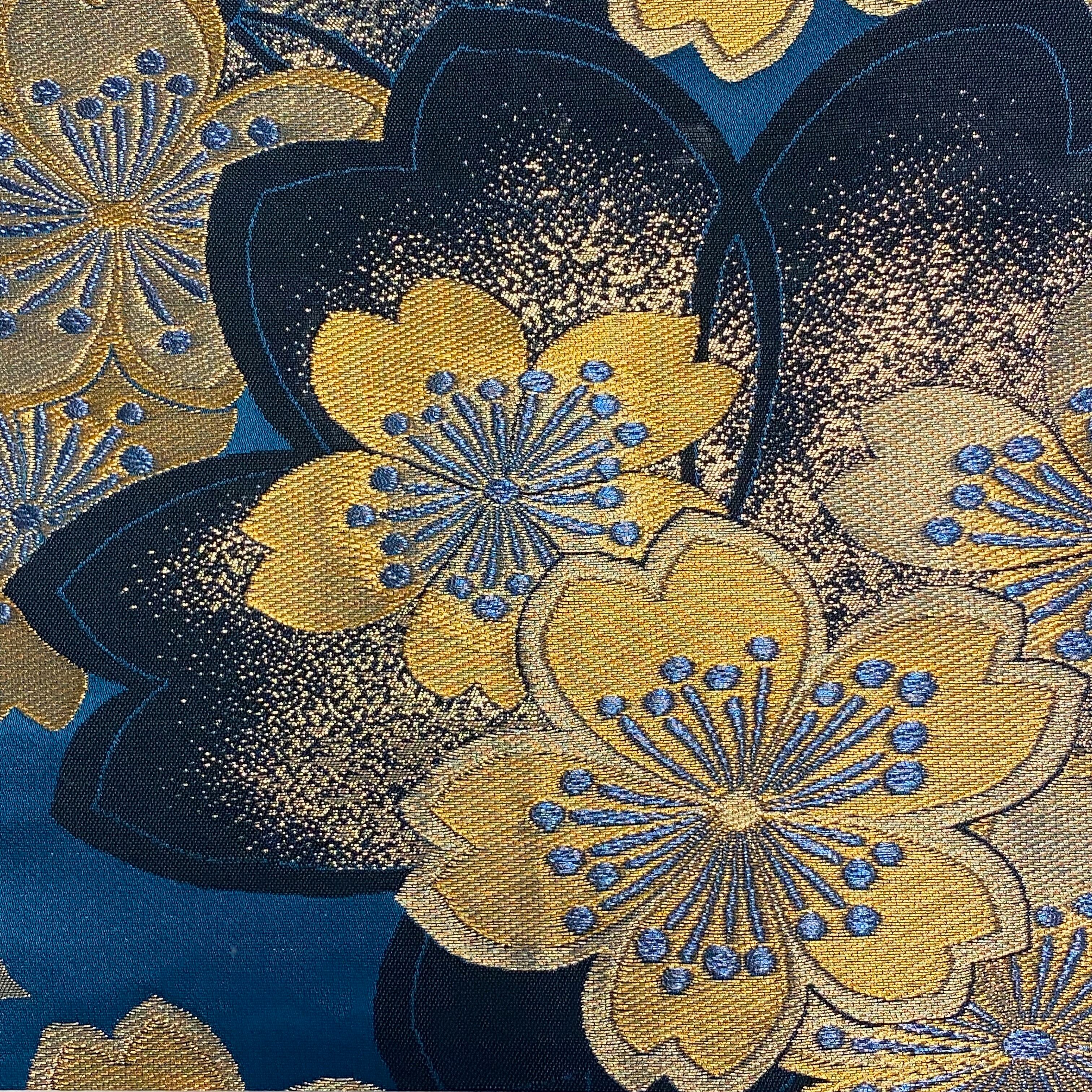アンティークの帯を額に仕立てました。青地に淡い色合いの桜が金糸で織り込まれています。お部屋に1枚飾ることで華やかで明るく晴れやかな雰囲気になります。