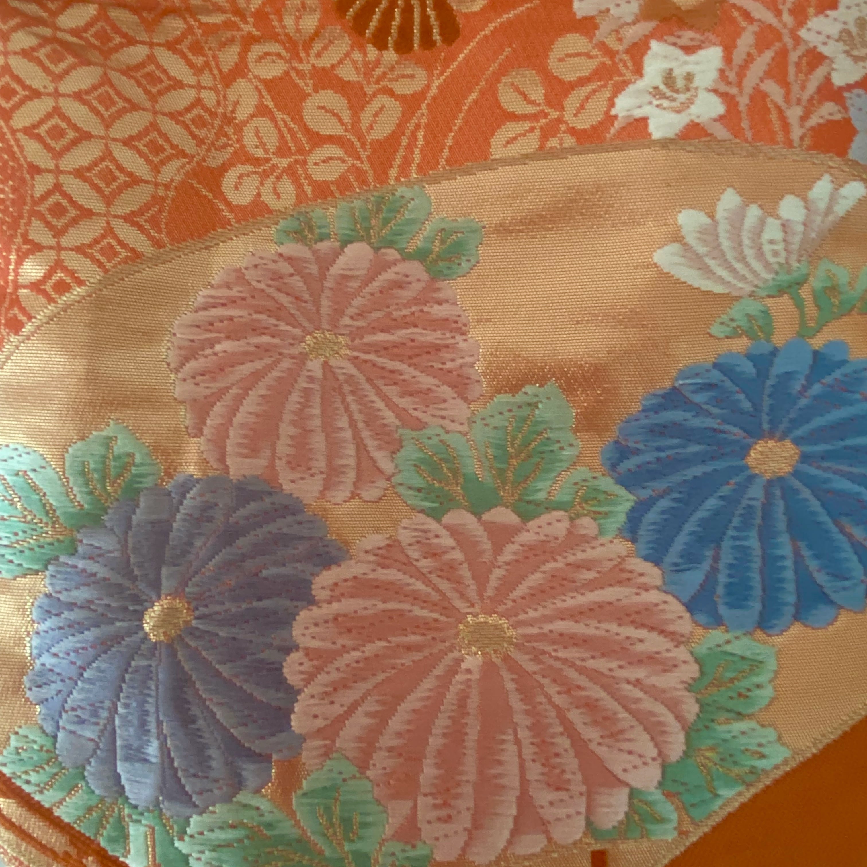 光沢のある朱色をベース菊や梅、桔梗、撫子など四季折々の花で飾られた扇子が美しく織り込まれています。華やかでありながら上品、とても優美な扇子柄です。扇子は末広がりの形から繁栄のシンボルとされ、また福を呼び寄せるとして演技の良い人気の柄です。